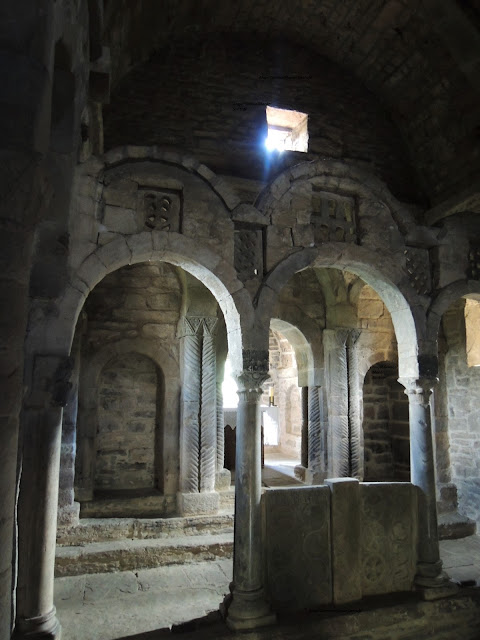 JUNTO Y BAJO ESTAS LINEAS: Al lado y abajo, columnas y capiteles en Santa Cristina de Lena, Asturias (a la que agradecemos nos permita divulgar nuestra imagen). Observemos la línea de luces naturales, obtenidas a través de un juego de ventanas.